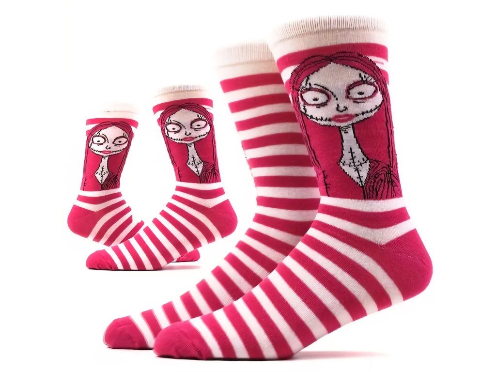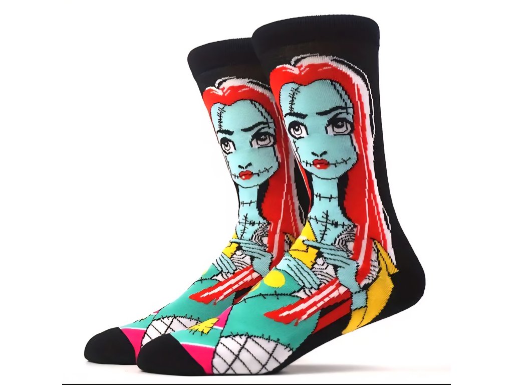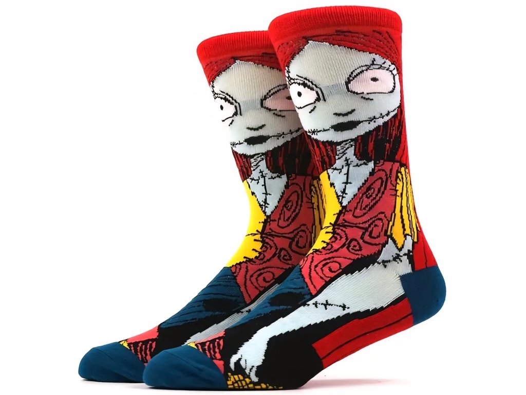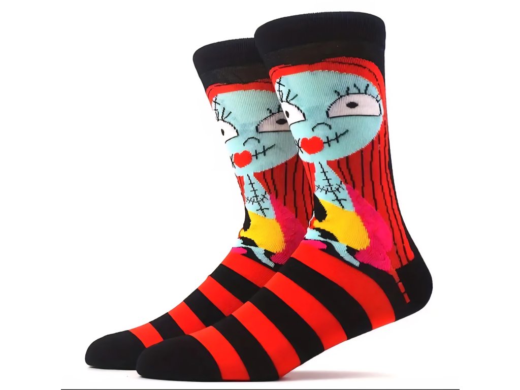 Červeno-černé pruhy a modrá tvář: Ponožky s portrétem Sally s její typickou modrou tváří a dlouhými červenými vlasy na podkladu s výraznými červeno-černými pruhy. (Viz soubor: Screenshot_20251010_125916_Temu.jpg)