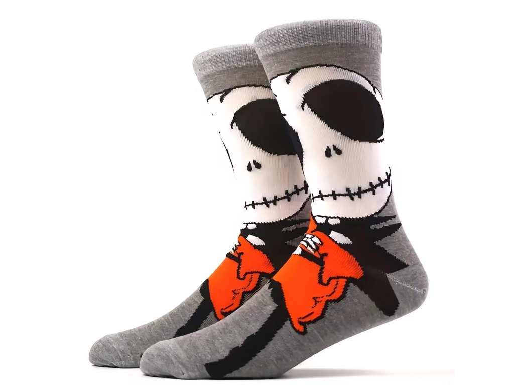 Jack s oranžovými akcenty: Šedé ponožky s portrétem Jacka a výraznými oranžovými detaily, které odkazují na barvy Halloweenu. (Viz soubor: Screenshot_20251010_125914_Temu.jpg)