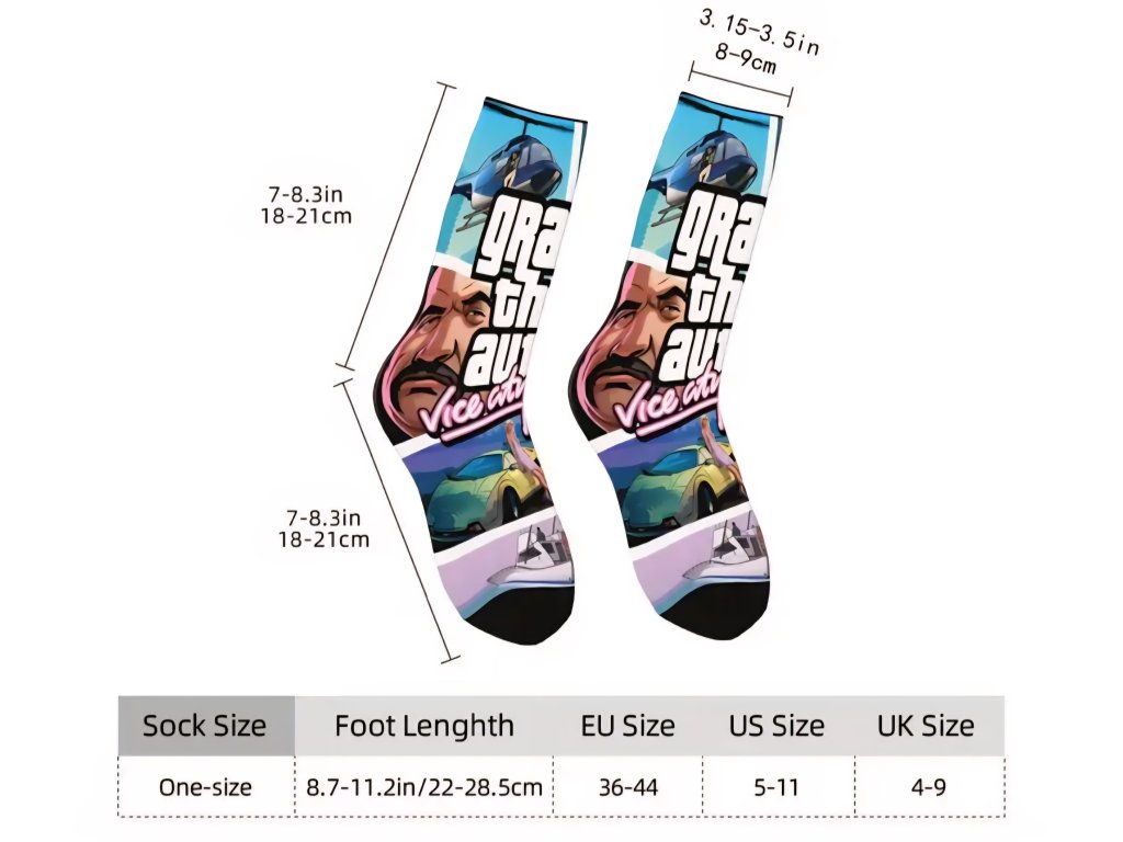Vraťte se do sluncem zalitých, neony osvětlených ulic Vice City 80. let! Tyto stylové a nepřehlédnutelné ponožky jsou absolutní nutností pro každého fanouška legendární herní série Grand Theft Auto. Je to perfektní způsob, jak ukázat svou vášeň pro jednu z nejlepších her všech dob a vnést trochu herní nostalgie do svého každodenního outfitu.