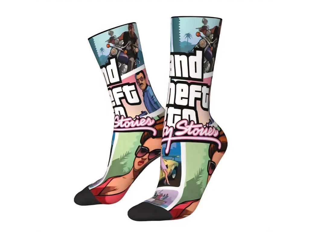 Ponožky se pyšní kvalitním a sytě barevným potiskem po celé své ploše, který zachycuje ikonickou grafiku a nezaměnitelnou atmosféru her Vice City a Vice City Stories. Od hlavních postav přes rychlá auta, vrtulníky až po legendární logo – každý detail je tu pro potěšení pravého gamera.