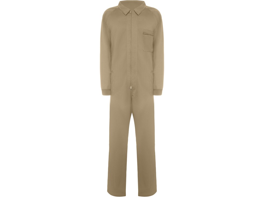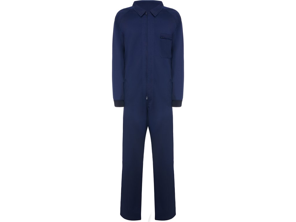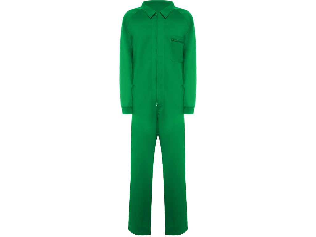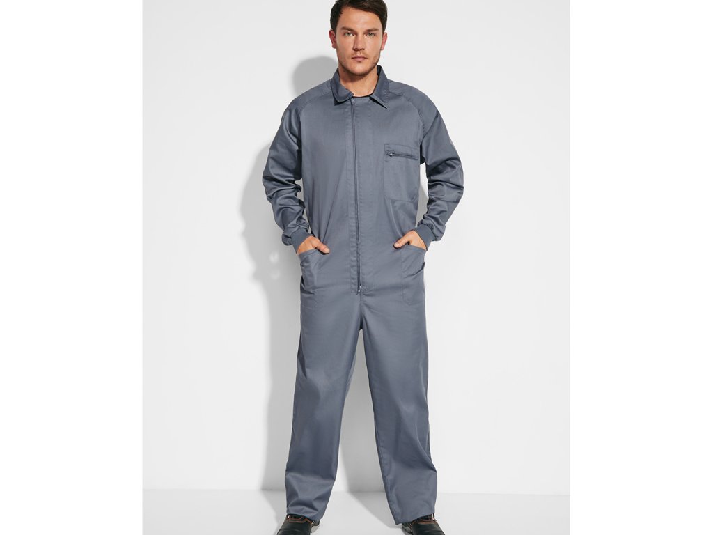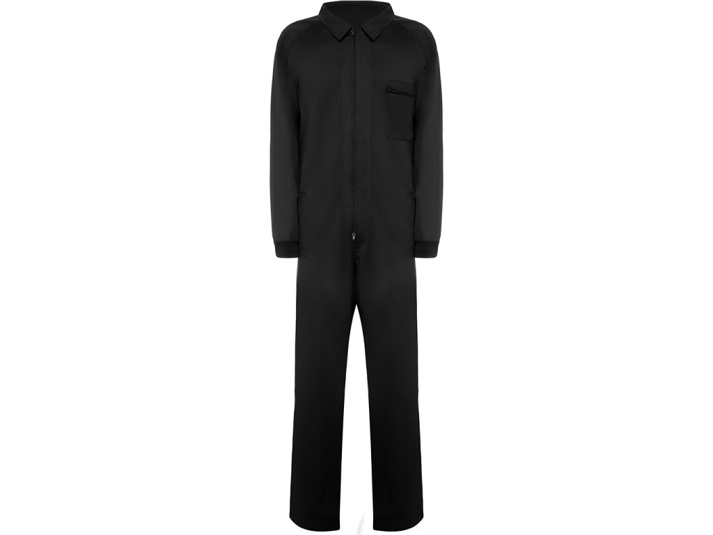 Pracovní kombinéza s předním zipem, levou náprsní kapsou na zip. Dále má dvě boční kapy, jednu úzkou boční kapsu a elastické manžety.