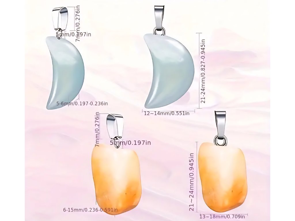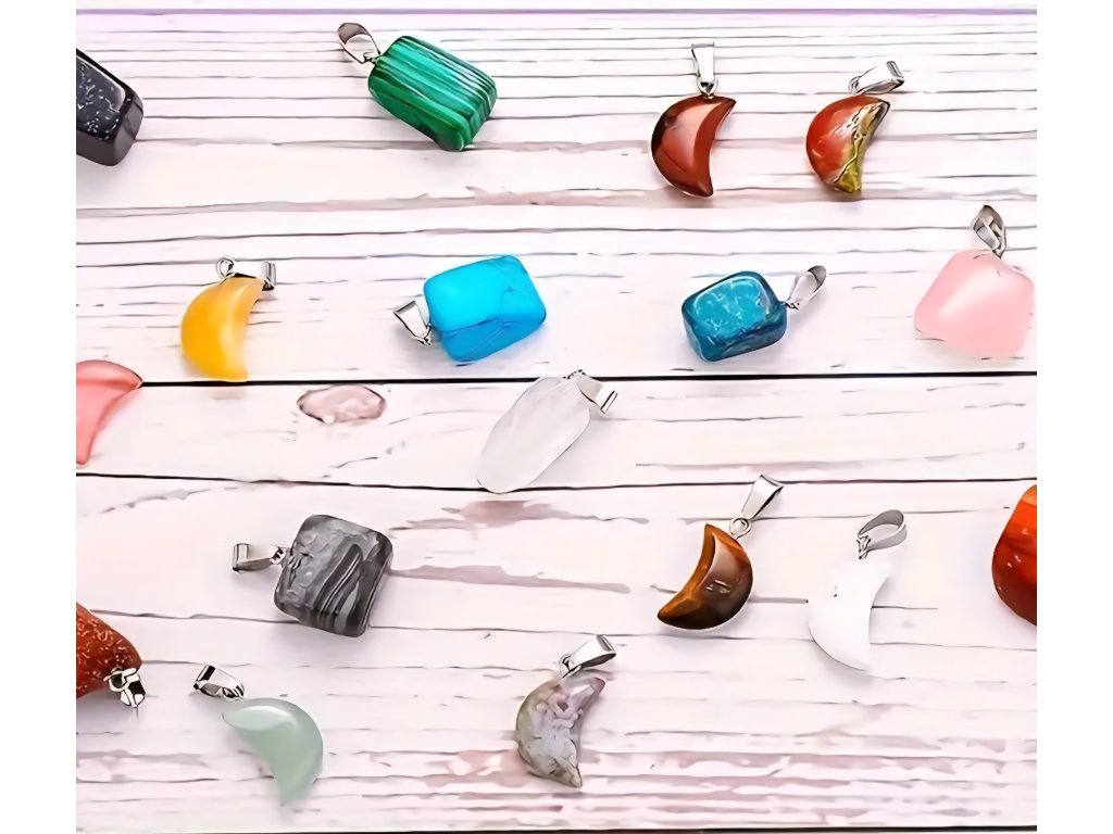Přívěsky zasíláme NÁHODNĚ z mnoha dostupných tvarů a druhů kamenů (například srpek měsíce nebo tromlovaný kámen v různých barvách a provedeních). Není možné si předem vybrat konkrétní tvar ani druh kamene.
