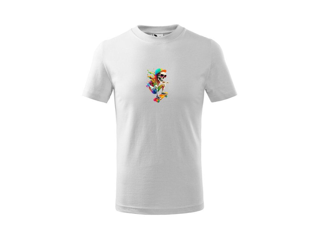 Stylové triko s originálním motivem skejtující kostry v duhových barvách. Buďte trendy a ukažte svůj jedinečný styl!