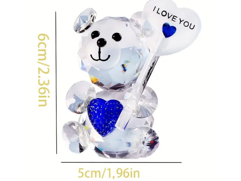 Hledáte drobný, ale okouzlující dárek z lásky? Tento nádherný skleněný medvídek řekne "Miluji Tě" za vás. Díky preciznímu facetovému brusu se figurka na světle krásně třpytí, hází odlesky a působí velmi luxusním dojmem. Je to ideální dárek k výročí, Valentýnu, narozeninám nebo jen tak pro radost.