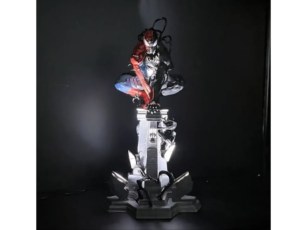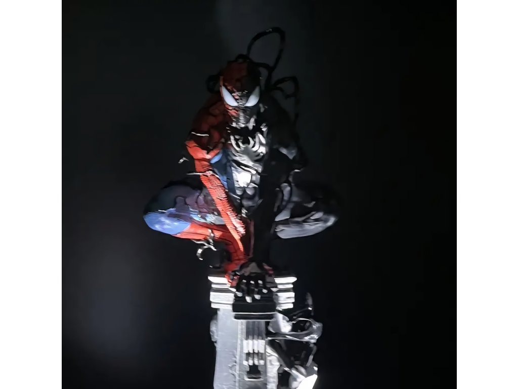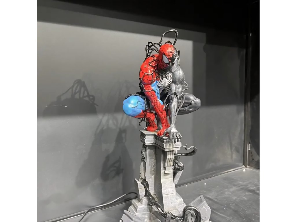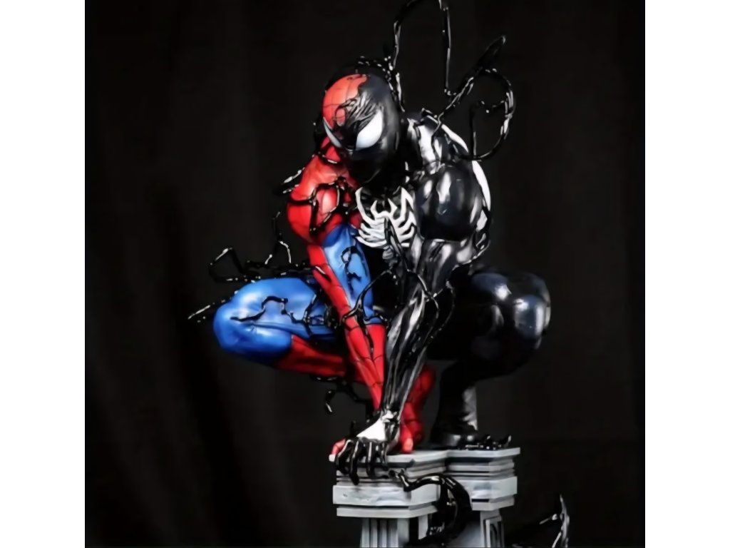 Soška zobrazuje hrdinu v dynamické, přikrčené pozici na vrcholu architektonického sloupu. Polovina těla patří klasickému Spider-Manovi v červenomodrém kostýmu, zatímco druhá se proměňuje v monstrózního, svalnatého Venoma. Detailně zpracovaná chapadla symbionta se vinou kolem postavy i samotného podstavce, čímž dotváří dramatickou scénu. Každý sval, textura kostýmu a prasklina v kameni je precizně zpracován a malován pro maximální realističnost.