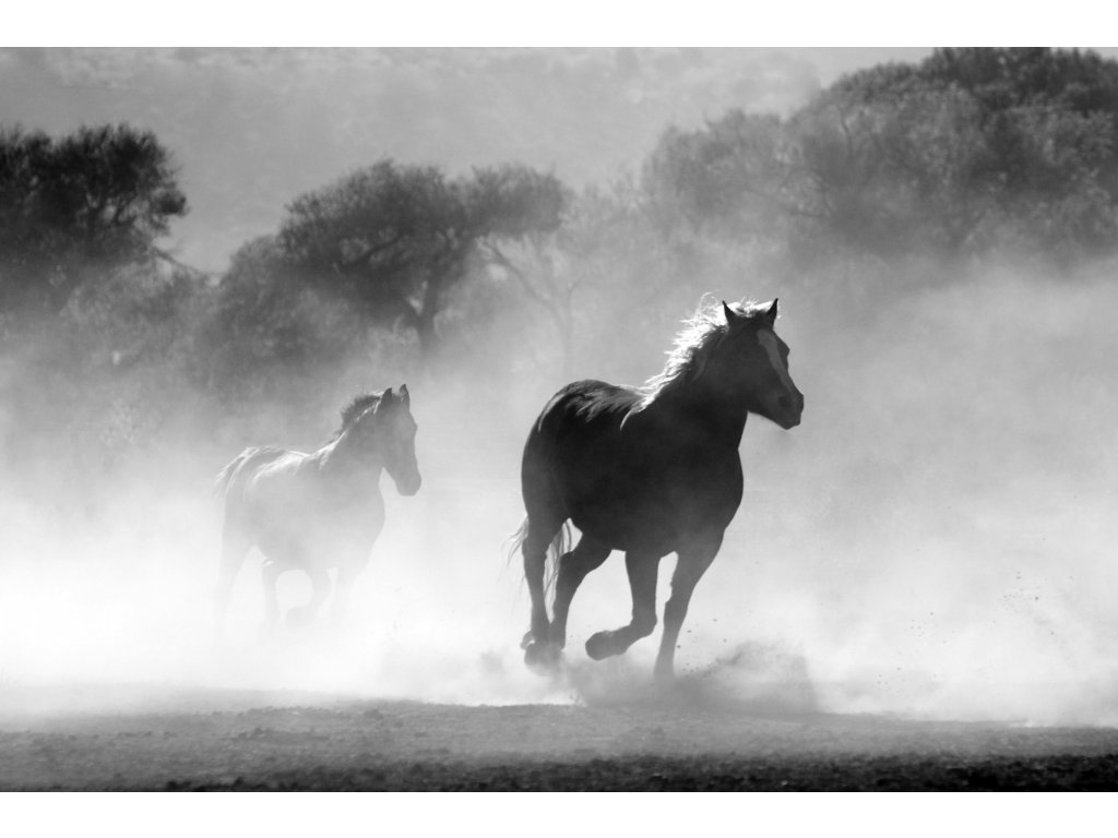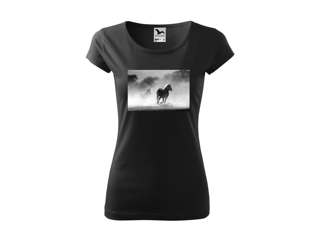 Stylové černé tričko s úchvatnou černobílou fotografií koní v mlze. Pro ženy, které milují sílu a krásu přírody.
