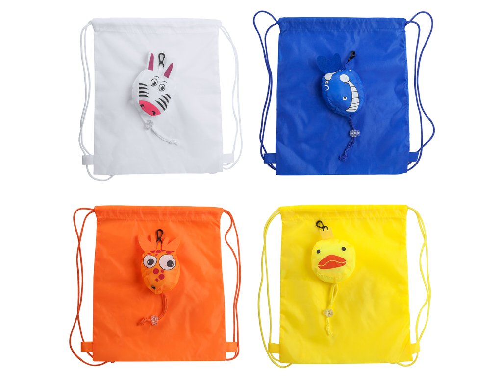 Skládací batůžek se stahovací šňůrkou z polyesteru 190T pro děti. Skládací pytlík s různými zvířecími vzory.