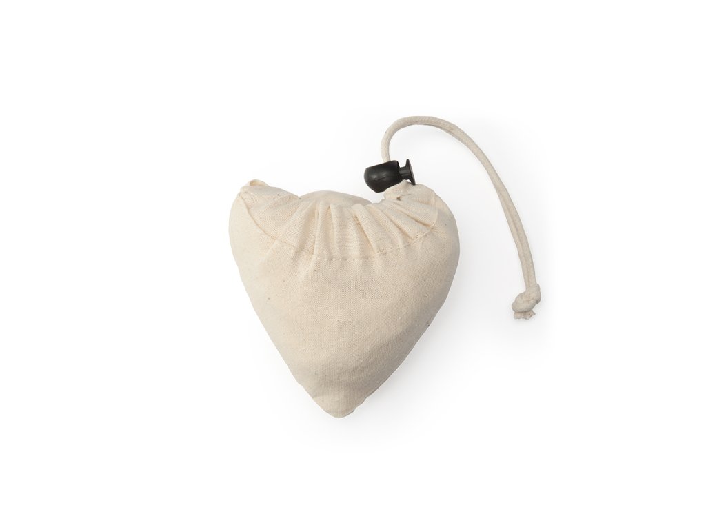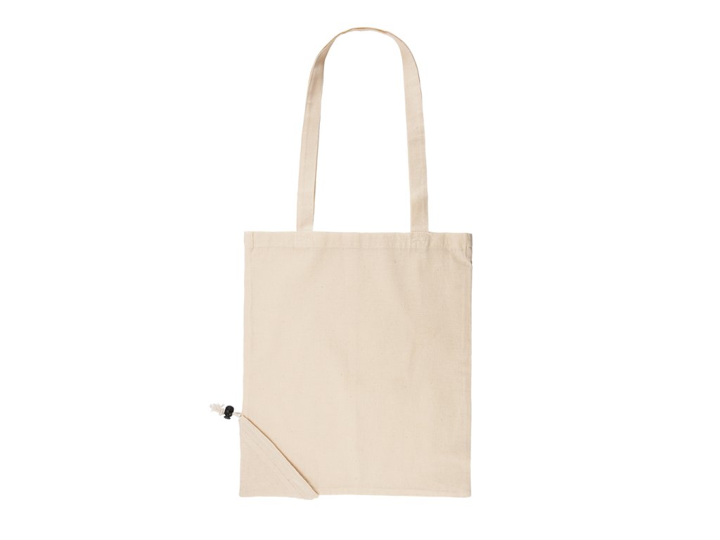 Skládací nákupní taška ze 100% bavlny o gramáži 105 g/m², se 70 cm dlouhými uchy a nastavitelným skládacím pytlíkem se stahovací šňůrkou.