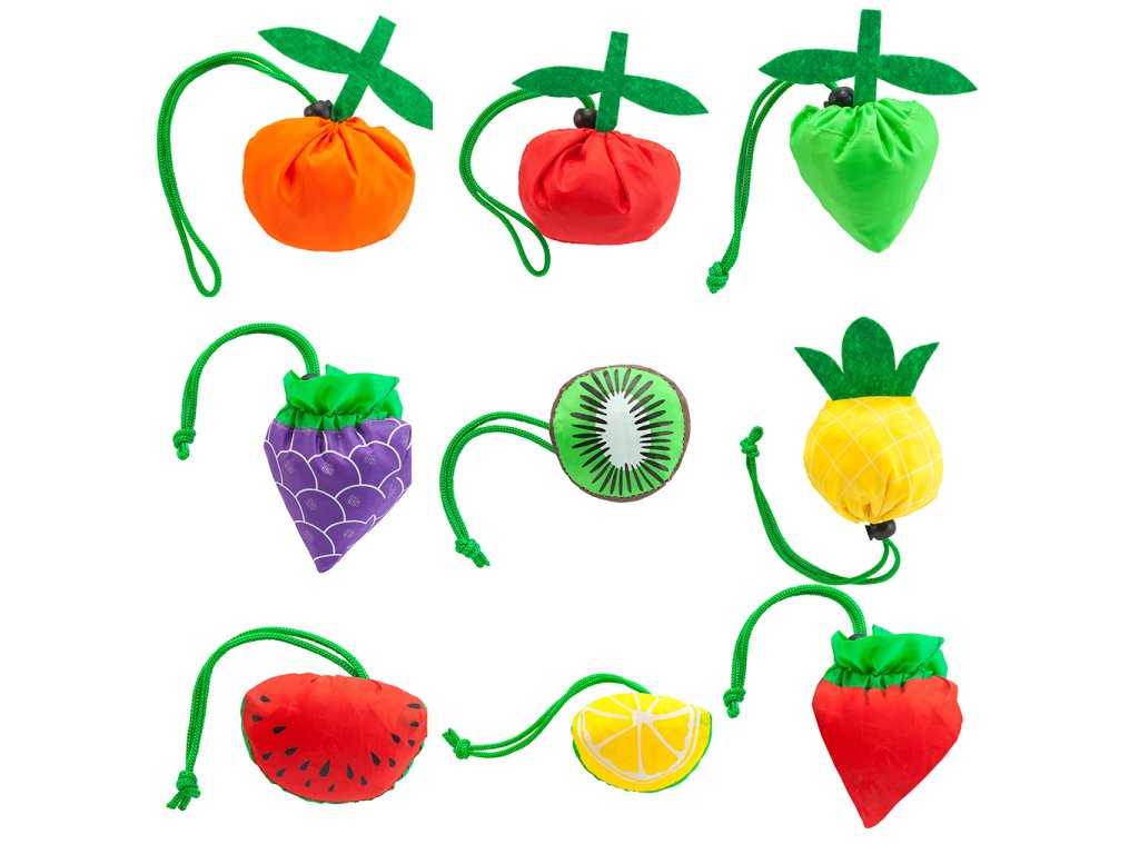 Skládací nákupní taška z měkkého polyesteru 190T. Různé vzory ovoce se stahovací šňůrkou.