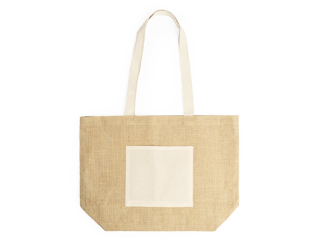 Taška z laminované juty s přední kapsou a dlouhými uchy z přírodní bavlny.