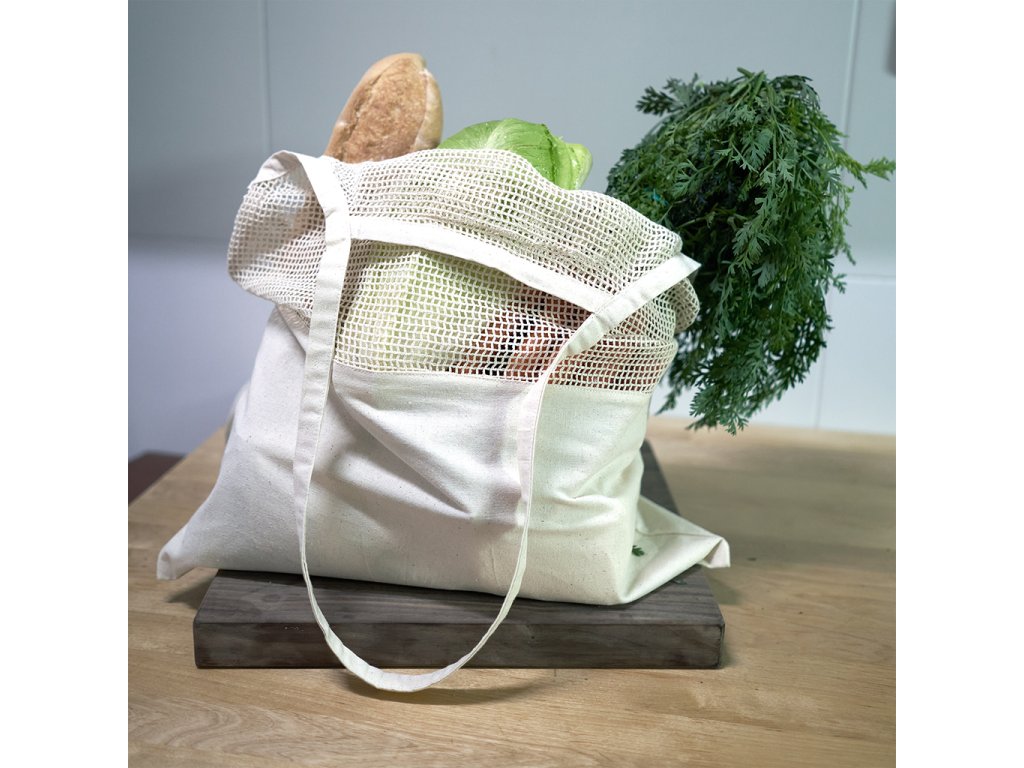 Nákupní taška z bavlny o gramáži 180 g/m² v hladkém a síťovaném provedení, se zesílenými uchy o délce 60 cm.