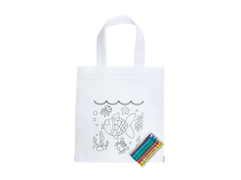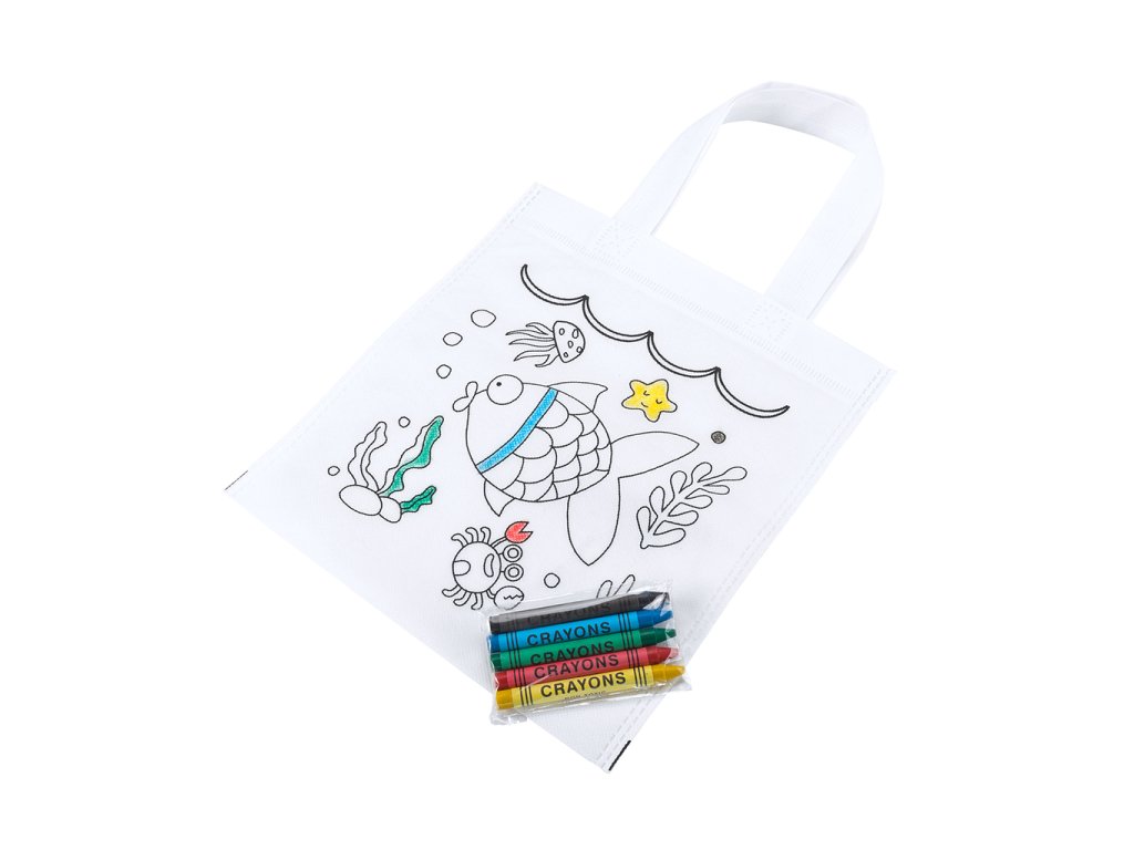 Taška z netkané textilie s designem k vybarvování. Součástí balení je 5 pastelek v různých barvách.