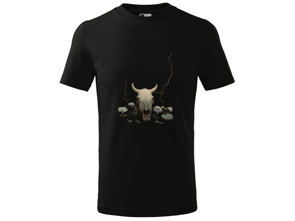 Noste na sobě kus tajemné přírody. Toto černé tričko zdobí umělecká kompozice s lebkou, obklopenou kameny, houbami a větvičkami. Design evokuje atmosféru dávných rituálů a hluboké spojení se zemí. Ideální pro ty, kdo nacházejí krásu v surových přírodních prvcích.