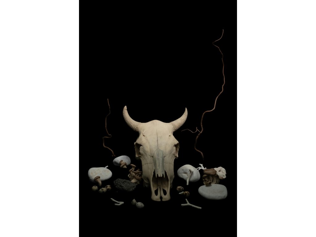 Umělecký design: Neotřelé zátiší s lebkou a přírodními elementy.