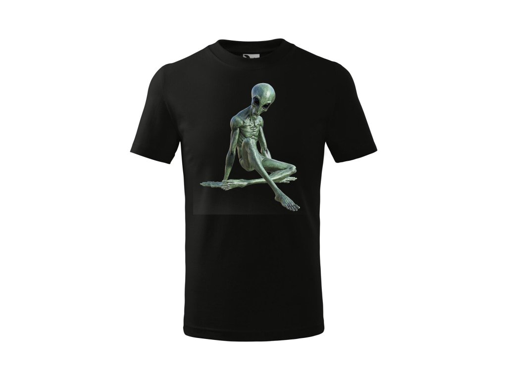 Černé tričko je vyrobeno z vysoce kvalitní a na dotek příjemné 100% bavlny. Jeho univerzální unisex střih je navržen tak, aby zaručoval maximální pohodlí a skvělý vzhled pro muže i ženy. Z temnoty černého podkladu vystupuje velký, hyperrealistický potisk celé postavy mimozemšťana v klidné, sedící póze. Každý detail, od textury kůže až po stínování štíhlého těla a hluboké černé oči, je precizně zpracován a vytváří úžasný 3D efekt.