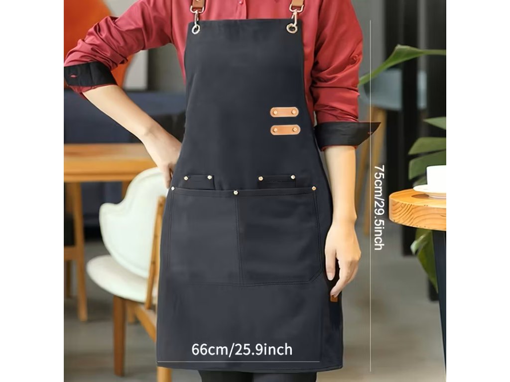 Spojení stylu a odolnosti pro každého profesionála. Tato černá zástěra z pevného plátna je vybavena praktickými kapsami, zesílenými kovovými nýty a elegantními detaily z kůže. Komfortní křížové popruhy zajišťují pohodlí i při celodenním nošení. Ideální pro baristy, kadeřníky, řemeslníky i umělce.