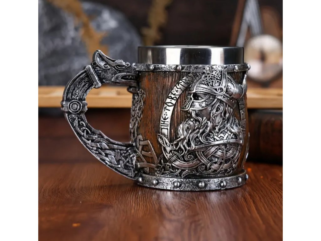 Připijte si na vítězství jako pravý severský válečník! Tento masivní a impozantní korbel je dokonalým spojením historického designu a moderní praktičnosti. Vnější plášť je vyroben z odolné, detailně tvarované pryskyřice, která věrně imituje dřevo a kovové reliéfy. Dominuje mu 3D portrét vikinského bojovníka s helmou, obklopený runovými nápisy a severskými ornamenty.