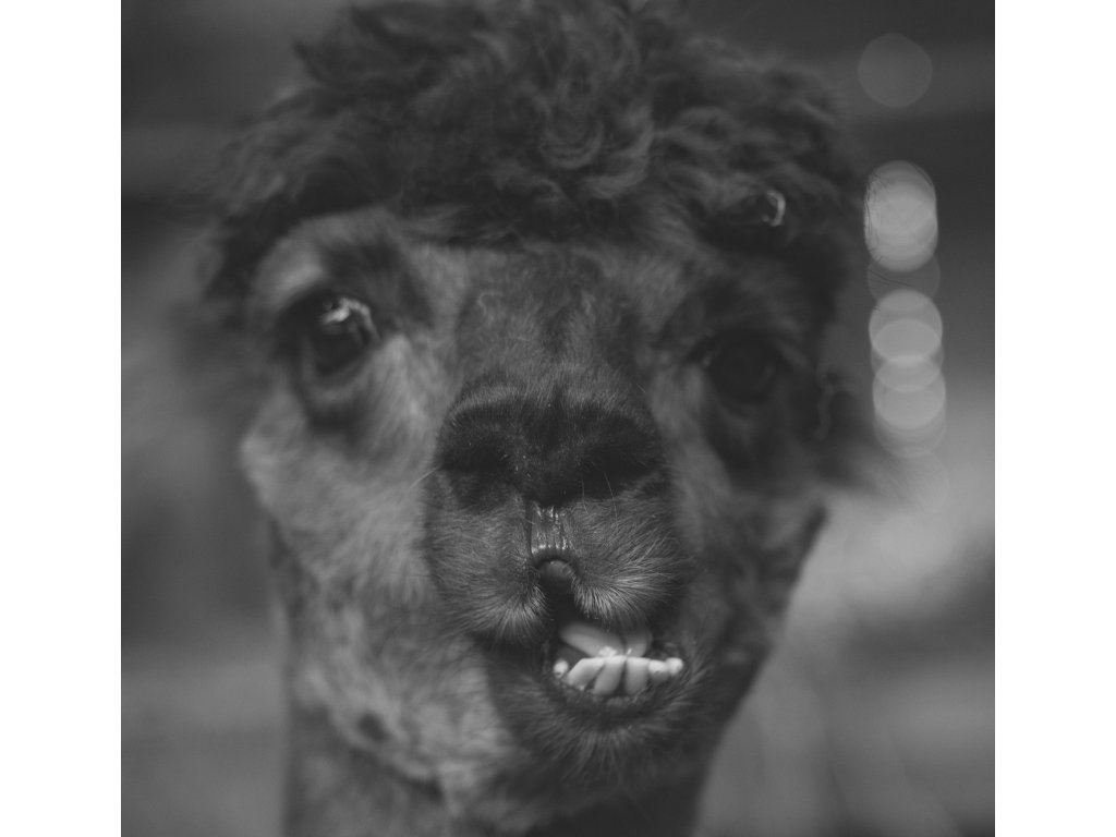 Zaručeně zlepší náladu vám i vašemu okolí! Toto černé tričko zdobí umělecký, ale neuvěřitelně vtipný portrét alpaky s neodolatelným úsměvem. Detailní černobílá fotografie dodává tomuto zábavnému motivu stylový nádech. Perfektní kousek pro milovníky zvířat a každého, kdo má smysl pro humor.