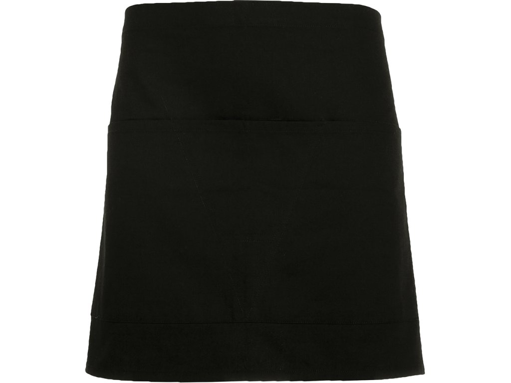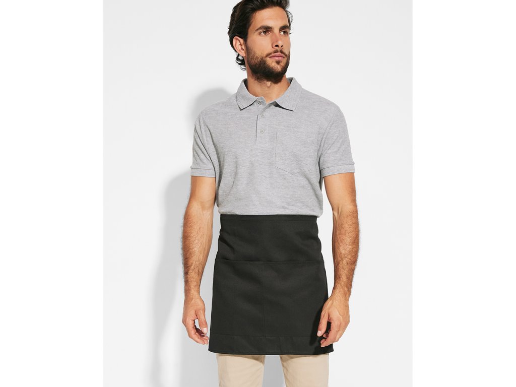 Kratší zástěra se dvěma kapsami. Postranní šňůrky na uvázání. Rozměry: 71 cm x 43 cm.