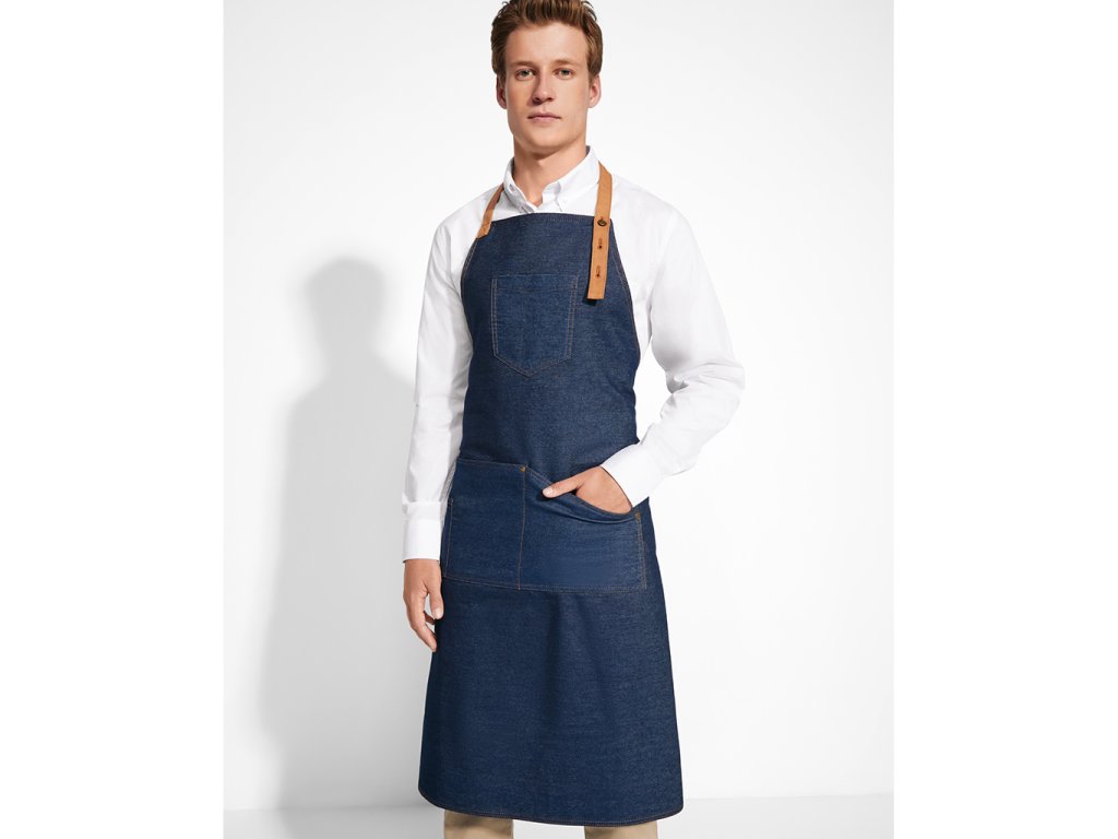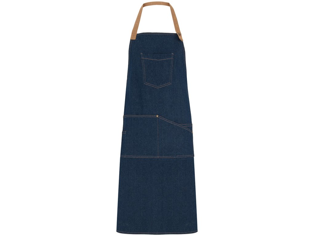 Dlouhá zástěra z džínoviny, která má kontrastní pásek za krk se třemi možnostmi nastavení kovovým knoflíkem, náprsní kapsu, čtyři přední kapsy s cvočky - jedna je určena speciálně pro propisovací tužku a postranní pásky na uvázání. Model je vhodný pro přípravu potravin.