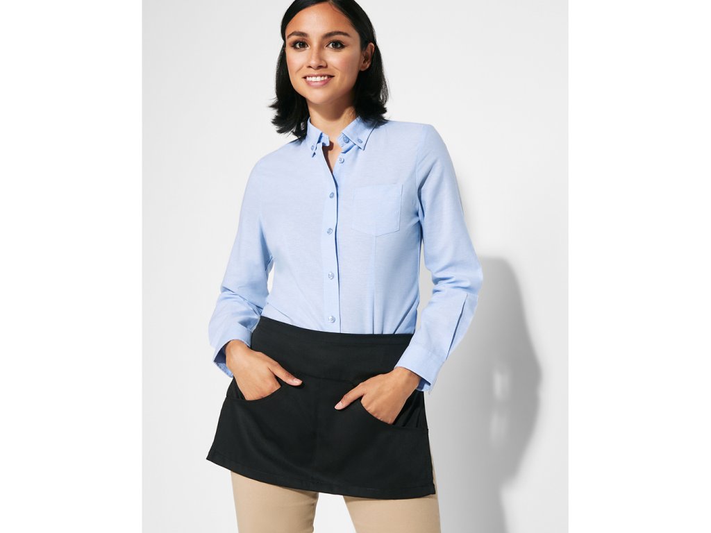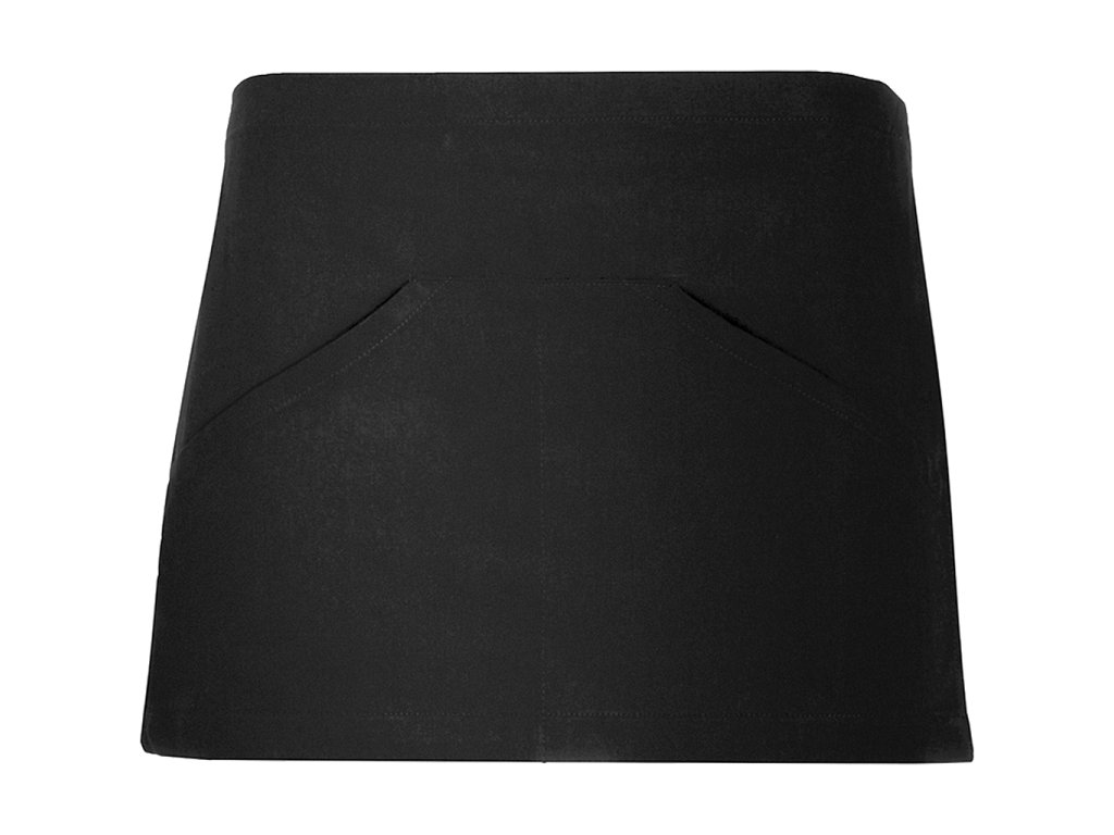 Krátká zástěrka se dvěma kapsami. Pásek po celém obvodu pasovky.